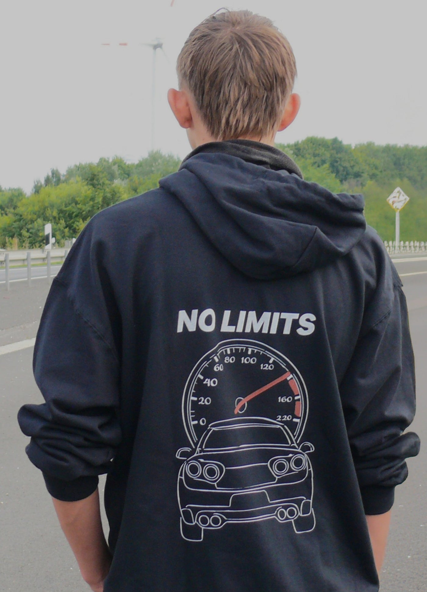 Der markante Backprint zeigt ein brachiales Fahrzeug-Frontmotiv vor einem Tachometer, dessen Nadel klar macht: NO LIMITS ist nicht nur ein Spruch – es ist ein Lifestyle. Genau die DNA von Skyburn: roh, schnell, rebellisch und immer bereit für die nächste Ausfahrt oder das nächste Tuning-Meet.